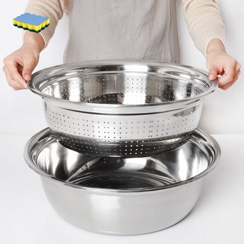 퀸센스 스텐 믹싱볼 + 대형 채반 2P 세트 대용량 타공 펀칭볼 바스켓 + 수세미, 1세트